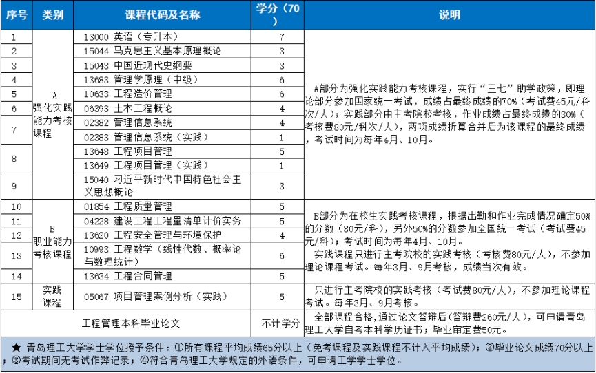 (一)工程管理(专升本) 本科文凭及学士学位颁发院校:青岛理工大学 专业代码:120103